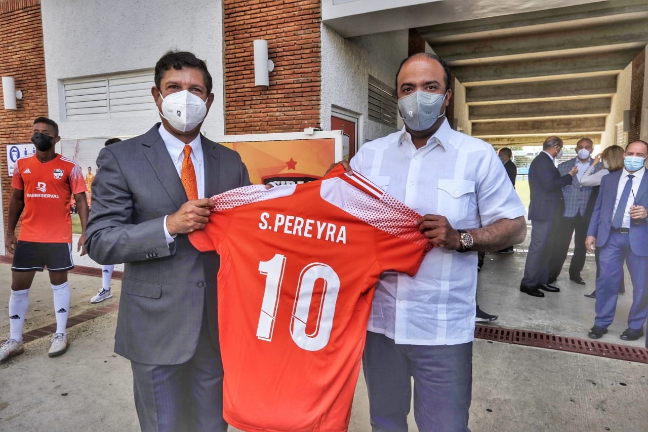 El ingeniero Manuel Estrella, presidente del Cibao FC, y el administrador general de Banreservas, Samuel Pereyra, al hablar en la ceremonia expresaron su optimismo con respecto a que el Cibao celebrará este año su segundo campeonato de la liga.