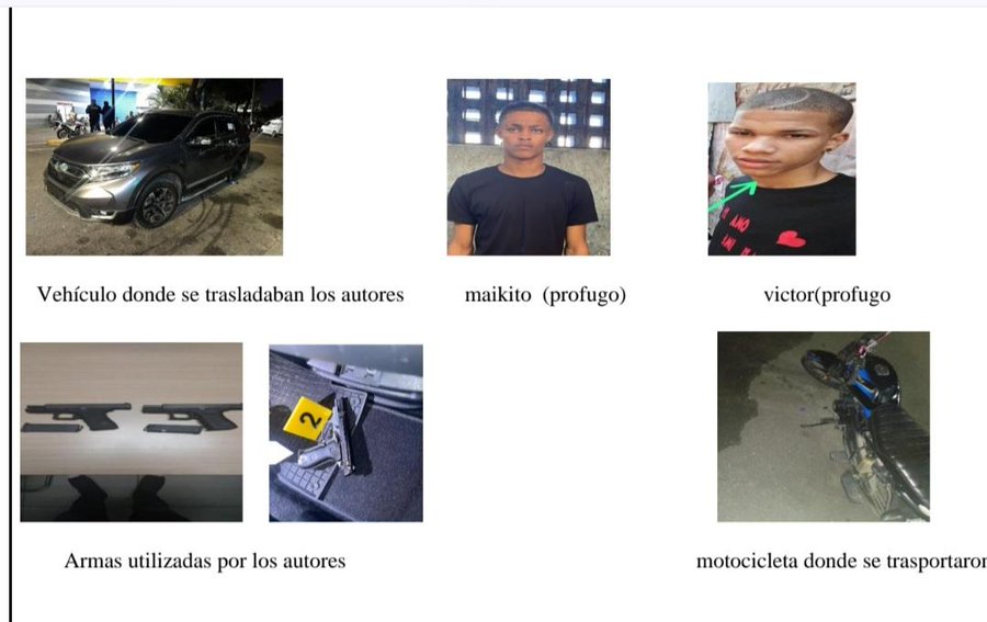 Asimismo, resultó herido del mismo tipo Carlos Carolo Taveras, de 24 años, quien se encontraba junto a Franyi dentro de la jeepeta marca Honda CR-V, gris oscuro, placa No. G676799, donde se ocupó una pistola marca Browning, calibre 380, de numeración ilegible, dos casquillos del mismo calibre y dos chaquetas de proyectil.