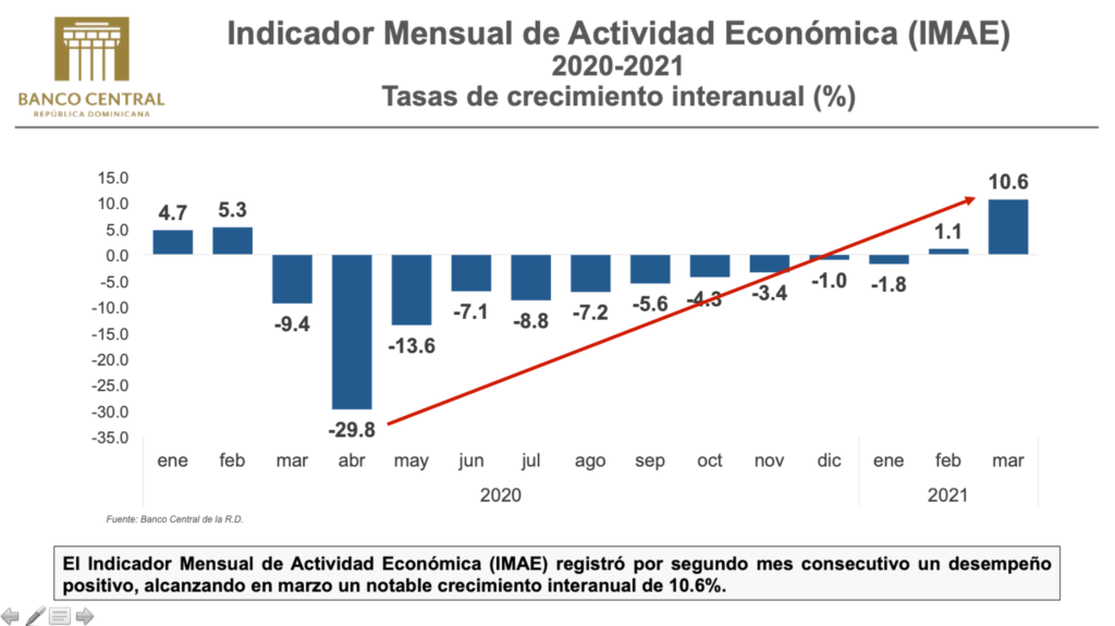 En ese sentido, luego del crecimiento de 1.1 % del mes de febrero, las cifras preliminares del índice mensual de actividad económica (IMAE) arrojan un significativo crecimiento interanual de 10.6 % en el mes de marzo, segunda tasa positiva desde iniciada la pandemia”.