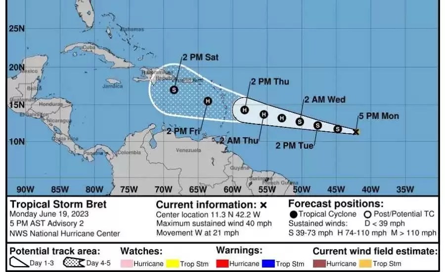 Santo Domingo RD,>La ONAMET, informa que a la tormenta tropical BRET, localizada a unos 1,815 al Este de las Islas de Barlovento, se mueve hacia el oeste a unos 28 kph, con viento máximo de 65 kph. Se recomienda a las diferentes instituciones de protección civil y la población en general estar atentos a los próximos boletines emitidos desde este Centro Nacional de Pronósticos.