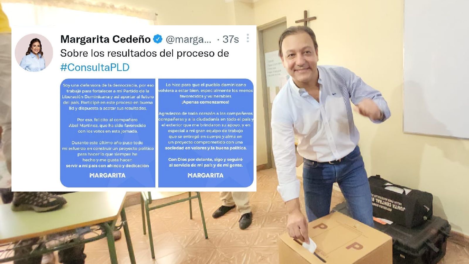 Santo Domingo RD,>La precandidata presidencial del Partido de la Liberación Dominicana (PLD) y exvicepresidenta de la República, Margarita Cedeño, felicitó la noche de este domingo a Abel Martínez por su victoria en la consulta interna de esa organización y convertirse así en el próximo candidato presidencial de ese partido para las elecciones del 2024.