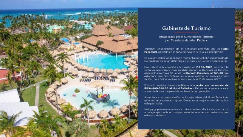 Santo Domingo, RD.– El Gabinete de Turismocomunicó este viernes que tiene conocimiento de la actividad realizada por el hotel Palladium, ubicado en la zona de Bávaro, Punta Cana y la calificó de inaceptable.