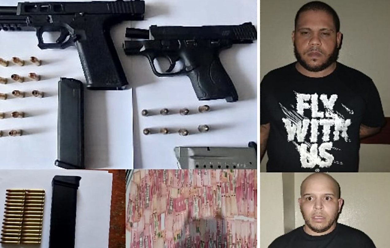 La Vega,>La Policía Nacional de La Vega informó que fueron apresados en flagrante delito dos hombres identificados como Cristian Santana y Enrique Augusto Esquerren, residentes en Santiago, a quienes se le ocupó en su cinto una arma de fuego tipo pistola, marca Glock, color negro, calibre 9mm, de serie no legible con su cargador y 11 cápsulas para la misma, la cual portaba sin ningún tipo de documentos, además se le ocupó la cantidad de $98,000.00 pesos.