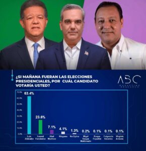 Una diferencia mayor a 34% con quien ocupa el segundo lugar Santo Domingo RD,>El presidente Luis Abinader ganaría con un...